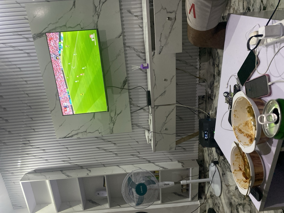 A room displays a TV showing a soccer game. The TV is mounted on a marble-patterned wall. Below the TV is a white marble shelf and a white bookshelf with a fan. A white table sits to the right, cluttered with phones, chargers, keys, dirty serving dishes, and a soda can. A person’s leg is visible next to the table.