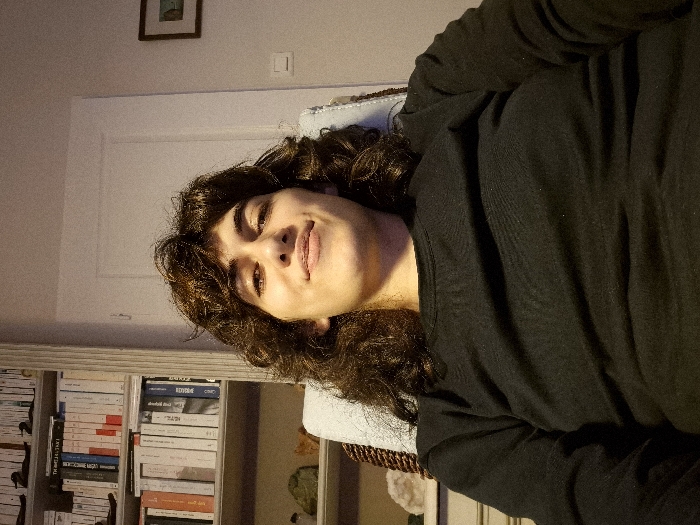 The image depicts an individual seated indoors in Châtelaillon-Plage, France. A young adult, with shoulder-length dark curly hair and fair skin, is centrally positioned, facing the camera with a slight smile. The individual wears a black, long-sleeved crew-neck shirt and is seated in a chair with a visible light-colored cushion and a brown wicker-like frame. To the left of the individual, a light-colored wooden bookshelf occupies the background. The bookshelf contains multiple rows of books of varying sizes and colors, along with several decorative items including small dark figurines (possibly ducks) on the top shelf and what appear to be geological specimens (rocks/crystals) on lower shelves. To the right of the individual, a light-colored wall is visible. A white closed door with a doorknob is present on the right side of the frame. Below and to the right of the door, a white rectangular light switch is mounted on the wall. Further right and above the switch, a small, dark-framed picture with a light-toned image hangs on the wall. The scene is illuminated by an unseen light source, casting soft shadows.