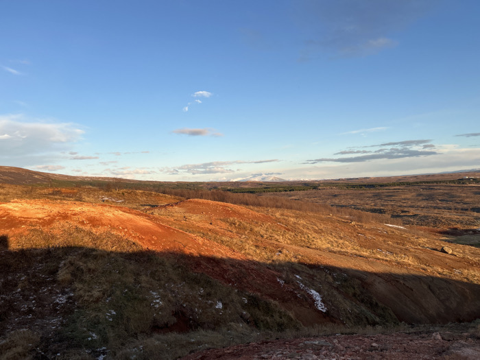 The scene depicts a panoramic view of a geothermal landscape located in Unknown, Iceland, under a clear blue sky with scattered white clouds. Directional sunlight, consistent with late afternoon or early morning, illuminates the terrain, creating sharp contrasts between light and shadow. The foreground and midground feature rolling hills characterized by vibrant reddish-orange earth, interspersed with areas of golden-brown dry grass and sparse darker vegetation. A prominent, diagonal shadow line from an unseen foreground element cuts across the lower and mid-sections of the hills. Small, scattered patches of snow are visible on various slopes. In the distant midground, a horizontal band of dark green trees or dense shrubs stretches across the frame. Beyond this, the landscape flattens into a vast, brown plain that recedes towards a hazy horizon, where distant, snow-capped mountains are visible. No individuals, man-made structures, or animals are present in the captured environment.