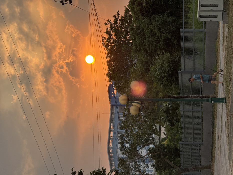 This image depicts an outdoor urban scene at sunset in Dĩ An, Vietnam. The upper portion of the frame is dominated by a vibrant orange and yellow sky with scattered clouds, showcasing a bright, circular orange sun disk in the upper right quadrant. Multiple dark power lines stretch horizontally across the sky. In the midground, a multi-story building with a light blue facade and a prominent darker blue roof structure is partially visible behind a dense line of green trees and bushes. The foreground features a paved ground surface with patches of dirt. A tall, dark green street lamp with three spherical yellow light fixtures stands centrally; the rightmost fixture exhibits a distinct orange lens flare. To the right of the street lamp, an adult male walks from left to right. He wears a blue-green short-sleeved shirt, dark shorts, and dark sandals. He holds a smartphone in his left hand and carries a fishing rod over his right shoulder. Behind the man, a dark grey metal fence with vertical slats extends horizontally across the midground. To the far right, two light-colored, rectangular utility boxes are visible at ground level.