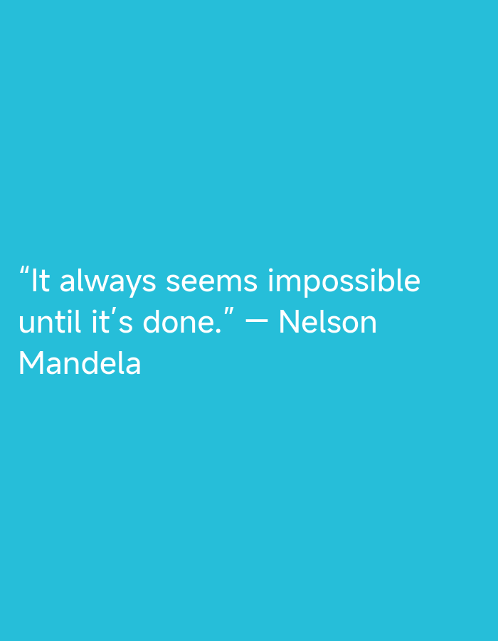 The image presents a solid teal-colored background. Prominently displayed in white sans-serif typeface, centered horizontally and occupying the lower-middle vertical section, is the quote: "It always seems impossible until it's done." This quote is attributed to "— Nelson Mandela," positioned below the quote itself. No people, discernible objects other than the text, actions, or interactions are present. The environment consists exclusively of this uniform colored surface. This scene is located in the city of Gorski Izvor, Bulgaria.