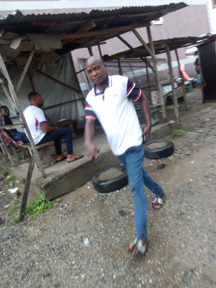 The image depicts an outdoor scene in Satellite Town, Nigeria, featuring three males and a rudimentary shelter. In the foreground, a bald, dark-skinned male in a white polo shirt with black and red accents, blue jeans, and black-and-white striped slide sandals moves towards the viewer. He holds a dark object in his left hand at waist level. Two dark vehicle tires lie flat on the wet, gravelly ground near his feet. To the left, under a makeshift shelter constructed from wooden posts and corrugated metal roofing, two other dark-skinned males are seated on wooden benches. The closer seated male wears a white polo shirt with blue and red trim, dark pants, and tan slide sandals, facing away from the camera. The furthest seated male wears a plaid shirt and dark pants. The ground is wet and appears muddy or gravelly, with scattered debris. A concrete curb or low barrier runs horizontally across the mid-ground. A light-colored multi-story building is visible in the background behind the shelter.