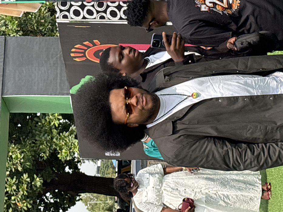 This image depicts an outdoor gathering in Itirin, Nigeria, featuring multiple individuals and decorative structures under bright daylight. The central figure is a male with a prominent dark afro hairstyle, wearing rimless gold-tinted sunglasses, a white t-shirt, an open dark olive-green jacket, and a necklace with a circular pendant bearing the colors of the Ghanaian flag. He stands facing forward with a neutral expression. To his right, a male in a dark open shirt over a white t-shirt holds a dark smartphone, appearing to record or photograph another male partially visible to his right, who wears a black graphic t-shirt and holds a dark bag. Behind the central figure and to his left, a female in a long white eyelet-embroidered dress, carrying a small dark red handbag, is positioned on green grass, looking downwards. In the background, a large tree with green foliage is visible, with blurred vehicles and a road suggesting an urban setting. Immediately behind the subjects, black panels decorated with an orange and red abstract sun/hand symbol and white circular patterns, along with green structural elements, indicate an organized event space.