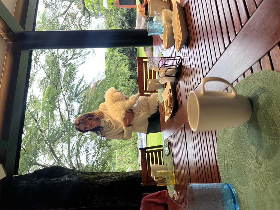 This image captures a semi-outdoor scene in Tetela Del Monte, Mexico, situated on what appears to be a covered patio or terrace overlooking a lush garden. In the foreground, a rectangular wooden slatted table is set for a meal. Objects on the table include a white ceramic mug on a green placemat in the immediate foreground, a blue textured glass tumbler, a yellow textured glass tumbler, and a smartphone. Further back on the table are several white rectangular and bowl-shaped dishes containing food items, a black wire caddy, and two additional white ceramic mugs. Standing behind the table, positioned centrally in the midground, is an individual with shoulder-length brown hair, wearing a light-colored cowl-neck top and dark pants. This person is holding a small, white, fluffy dog, which is oriented away from the camera. The individual looks directly towards the camera with a neutral expression. To the far left, partially visible at the table, is a person wearing a dark red garment. The background features a vibrant green garden with numerous trees and foliage under a bright sky. A swimming pool is visible in the distant left, and a large tree trunk occupies the far left of the frame. Dark structural beams of the patio roof are visible at the top of the image.
