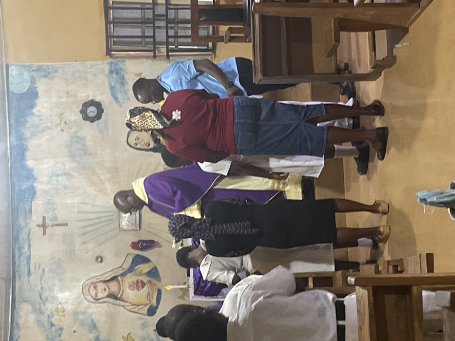In a church, a group of people are gathered, kneeling in prayer. The arrangement includes a priest in a purple robe, followed by congregants in casual attire. The backdrop is a painted mural featuring religious imagery, including a cross, Virgin Mary, and radiant beams. The church interior appears simple with wooden pews. The lighting is subdued, possibly from daylight filtering through windows. A clock is hung on the wall.