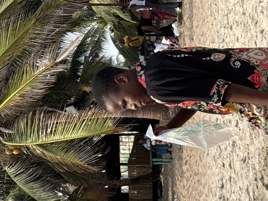 The image depicts an outdoor scene in Mopo-Akinlade, Nigeria, characterized by sandy ground and abundant palm trees under a bright, possibly hazy sky. In the foreground, slightly right of center, a young Black male child or adolescent stands, facing mostly forward but with his head turned right. He wears a short-sleeved black shirt adorned with a vibrant, intricate floral and ornate pattern in red, yellow, and other colors. His right hand holds a translucent white plastic bag, which appears empty or contains a light substance, with faint green lettering visible. The mid-ground and background feature multiple individuals and structures. To the left, several large palm trees dominate, some bearing visible coconuts. Behind these trees, a rustic structure with bamboo or wooden slat walls and a dark roof is visible, likely a shaded area. Inside, a female figure is seated at a table. String lights or decorative bulbs hang from the structure's canopy. To the right in the background, more palm trees are present. Several individuals are gathered: a woman in a yellow dress stands further back. Closer to the viewer, an adult figure, possibly female, is bending over, wearing a dark top and patterned lower garment. Nearby, another adult male stands in a white tank top and light trousers. Two small children are seated on the sand in front of the bending adult, one wearing pink clothing. The overall impression is a casual, populated outdoor setting, likely a beach or recreational area.