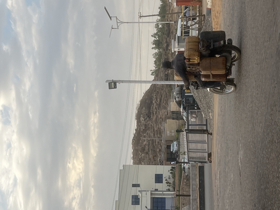 A person rides a motorcycle laden with boxes and containers on a paved road. Mountains rise in the background, with a mix of rocky terrain and sparse vegetation. A modern building with multiple windows is visible along the roadside. Utility poles and power lines stretch across the sky. The sky is overcast.