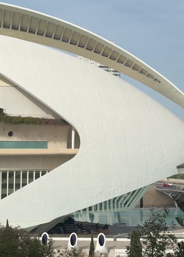 daytime shot of a modern white building with a curved, architectural design. The building has a large, smooth, white exterior surface with a curved opening, as well as a curved architectural element above it. There are other architectural details, including vertical supports and a lower section with a reflective surface. In the foreground, there are green trees and shrubs. In the background, there is a cityscape with buildings and a bridge. The sky is blue and slightly overcast. The camera slightly pans to the right during the video.