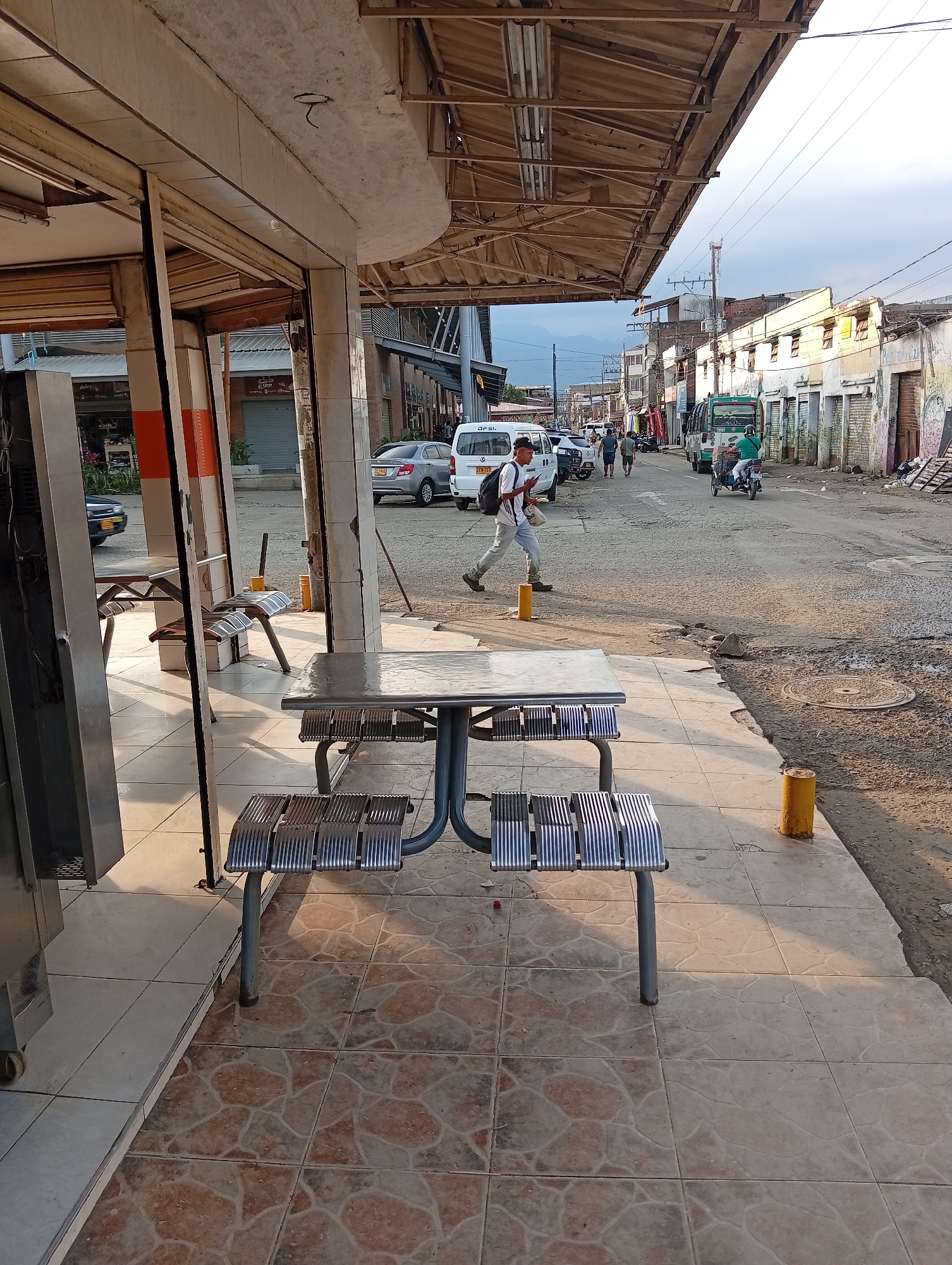 This image captures a street scene in Jamundí, Colombia, under an overcast sky with distant mountains on the horizon. The foreground is viewed from beneath a corrugated metal awning, supported by pillars, extending over a tiled sidewalk. A metallic table with attached slatted benches is prominent in the center-right foreground, with a similar, partially obscured set to the left. A large stainless steel appliance is on the far left. The sidewalk is tiled in light brown and tan patterned squares. Two yellow cylindrical bollards stand at the sidewalk's edge. The street, appearing worn with potholes and debris, features a circular manhole cover on the right. A male pedestrian, wearing a white t-shirt, light pants, and a dark backpack, walks from left to right across the street. Further down, three other men walk on the left, and a person in a green shirt rides a motorcycle away from the viewer on the right. Parked vehicles include a white van (partial license plate 'IEN 782') and a silver sedan. A small green bus is visible in the distance. Buildings lining both sides of the street are one to two stories, exhibiting aged facades, some with roll-down security shutters. Numerous overhead electrical wires crisscross the frame. A pile of debris is situated on the street's right side. The scene is lit by natural light, casting long shadows to the right.
