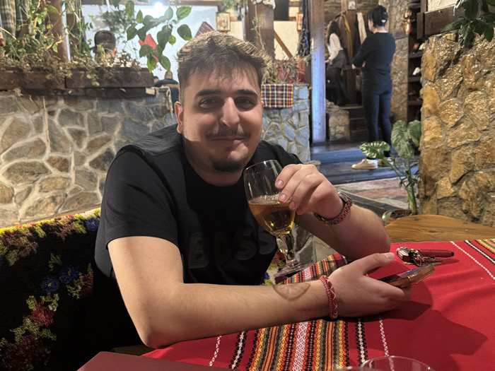 An indoor scene in Pleven, Bulgaria, depicts a young adult male seated at a table, facing the camera with a faint smile