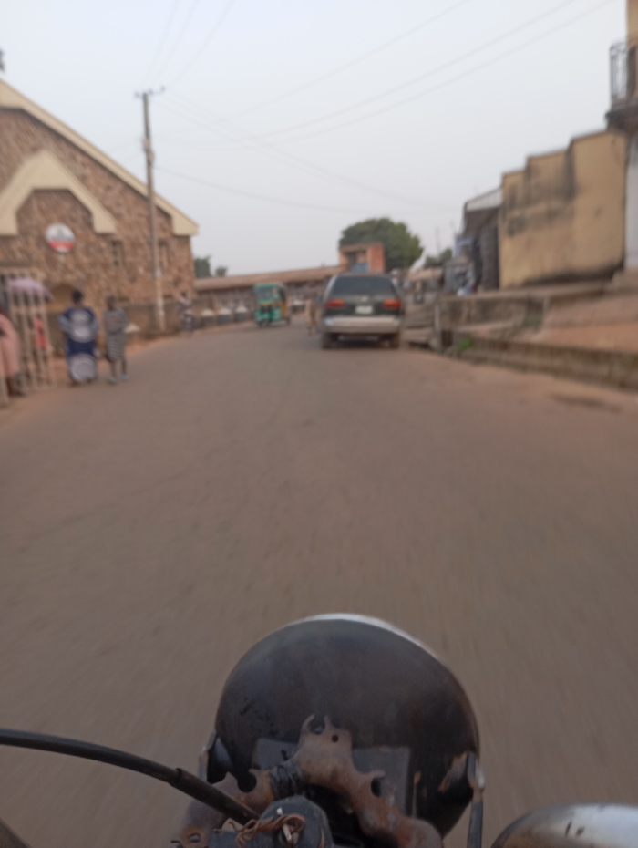 A street scene shot from a motorcycle rider's perspective, focusing on the road ahead. A gray minivan and a green tuk-tuk are further down the road. A church building is on the left with people standing in front of it. Buildings line the sides of the street. The sky is overcast, lending a muted tone to the scene. The motorcycle's headlight and handlebars dominate the foreground, appearing worn and rusty.