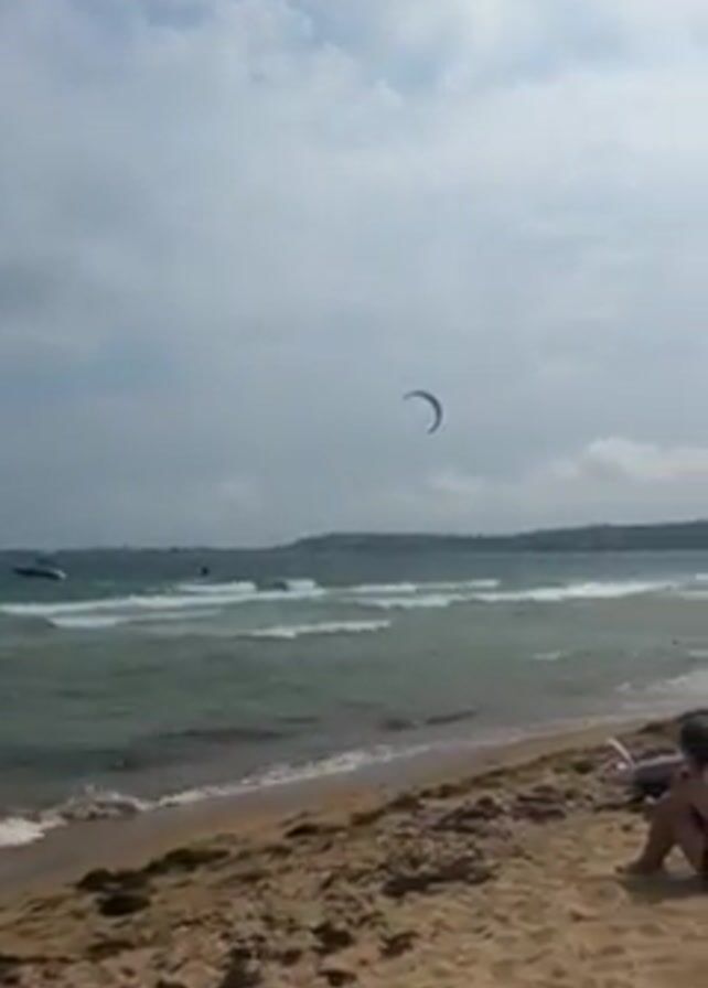 beach scene. The sky is partly cloudy. The sea is choppy, with waves breaking on the sandy shore. In the distance, there is land visible across the water. Several kitesurfers are active in the water, their kites clearly visible in the sky. On the beach, a few people are visible: a woman sits near some windsurfing equipment, a child is walking along the shoreline, and a couple is sitting together further down the beach. The foreground is dominated by the sand of the beach, with some seaweed or debris scattered near the water's edge.