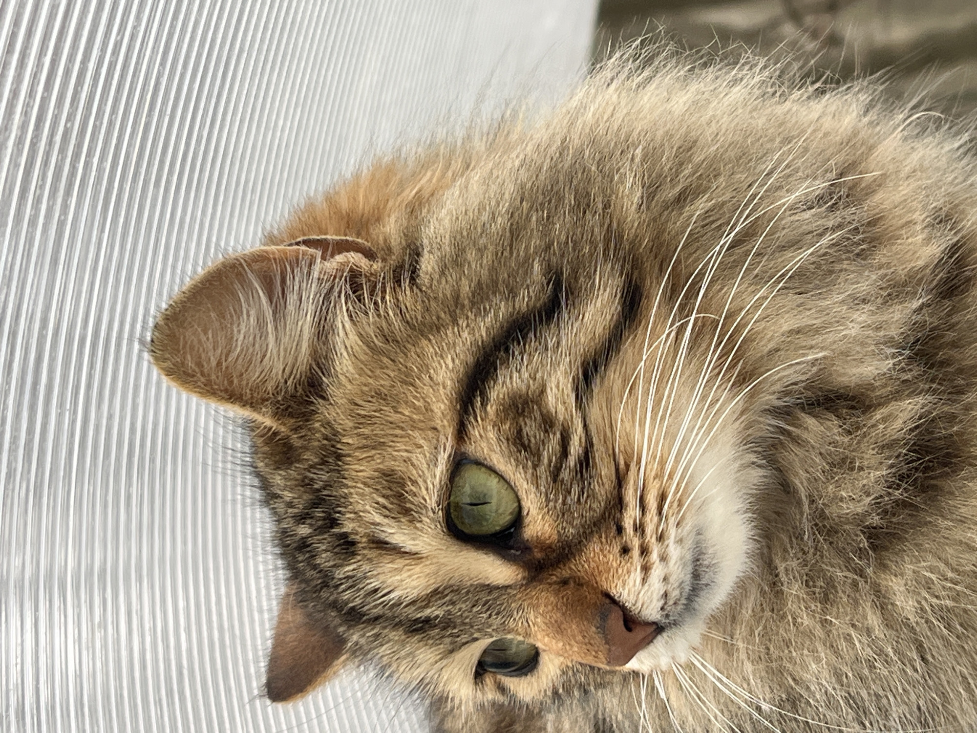 - "close-up of a brown tabby cat with green eyes, resting on a corrugated surface" by FM-SHO9l2, licensed under CC BY 4.0