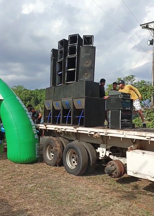small, rural gathering centered around a large flatbed truck carrying a massive sound system. The speakers are stacked high, dominating the scene. Several individuals are on the truck, adjusting equipment and dancing to music. One person is holding a sign with the words "LA FORMULA". On the ground, people are watching, and one person is riding a red and black ATV. A large green inflatable structure stands nearby. The background includes sparse vegetation, power lines, and a cloudy sky. A few vehicles are parked in the distance. The overall impression is a makeshift outdoor party.