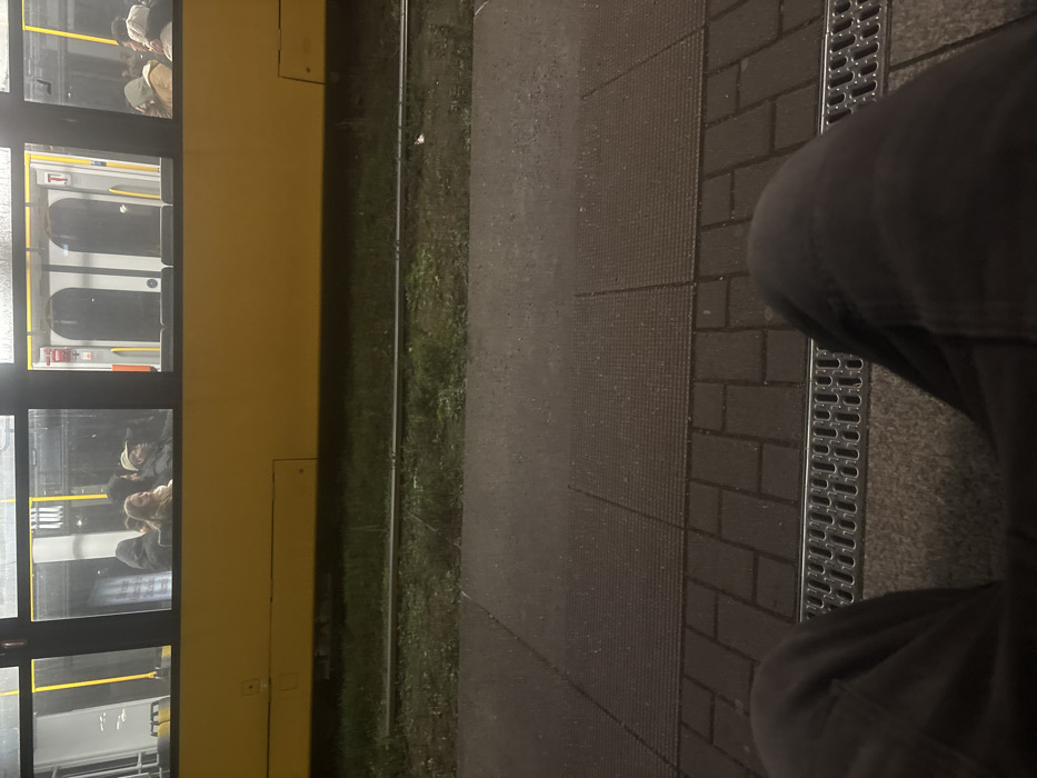- "A partially visible person's lap in gray pants sits near a paved platform, with a metal grate separating the person from the platform" by FM-WTbt02, licensed under CC BY 4.0