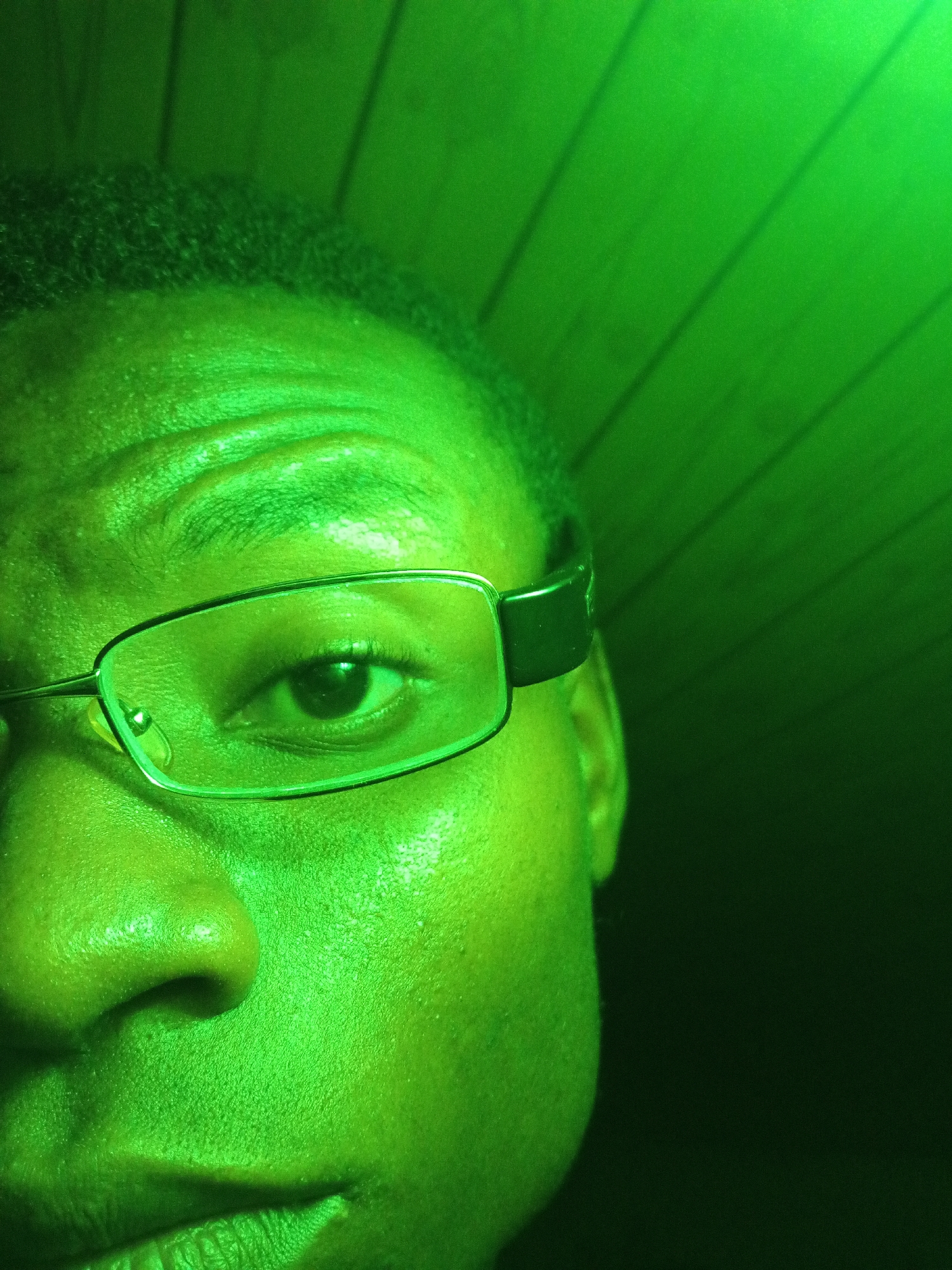 The scene is a close-up, high-contrast portrait of an individual, illuminated by strong green light, located in the city of Narayi, Nigeria. The subject, appearing to be of African descent, occupies the left and central portions of the frame, facing directly towards the viewer. The left eye, nose, and upper lip are prominent. The subject wears silver-framed eyeglasses, with the left lens covering the visible eye. Short, dark, tightly curled hair is visible on the upper left of the head. The skin texture shows pores and subtle wrinkles on the forehead. The visible eye is open with a direct gaze. The background, particularly in the upper and mid-right, features dark green wooden paneling with distinct parallel lines, suggesting a wall or ceiling. The intense green illumination saturates the entire image, creating a monochromatic effect.
