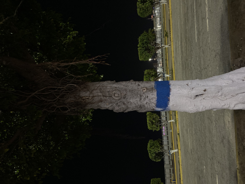 A tree trunk, partially painted white with a blue band, runs vertically along the right side of the image. Lush green foliage extends to the left, contrasting with the dark background. A row of meticulously trimmed trees lines the edge of a paved area, which dominates the upper-right portion of the scene. The lighting suggests a nighttime setting, with artificial illumination highlighting the parking area.