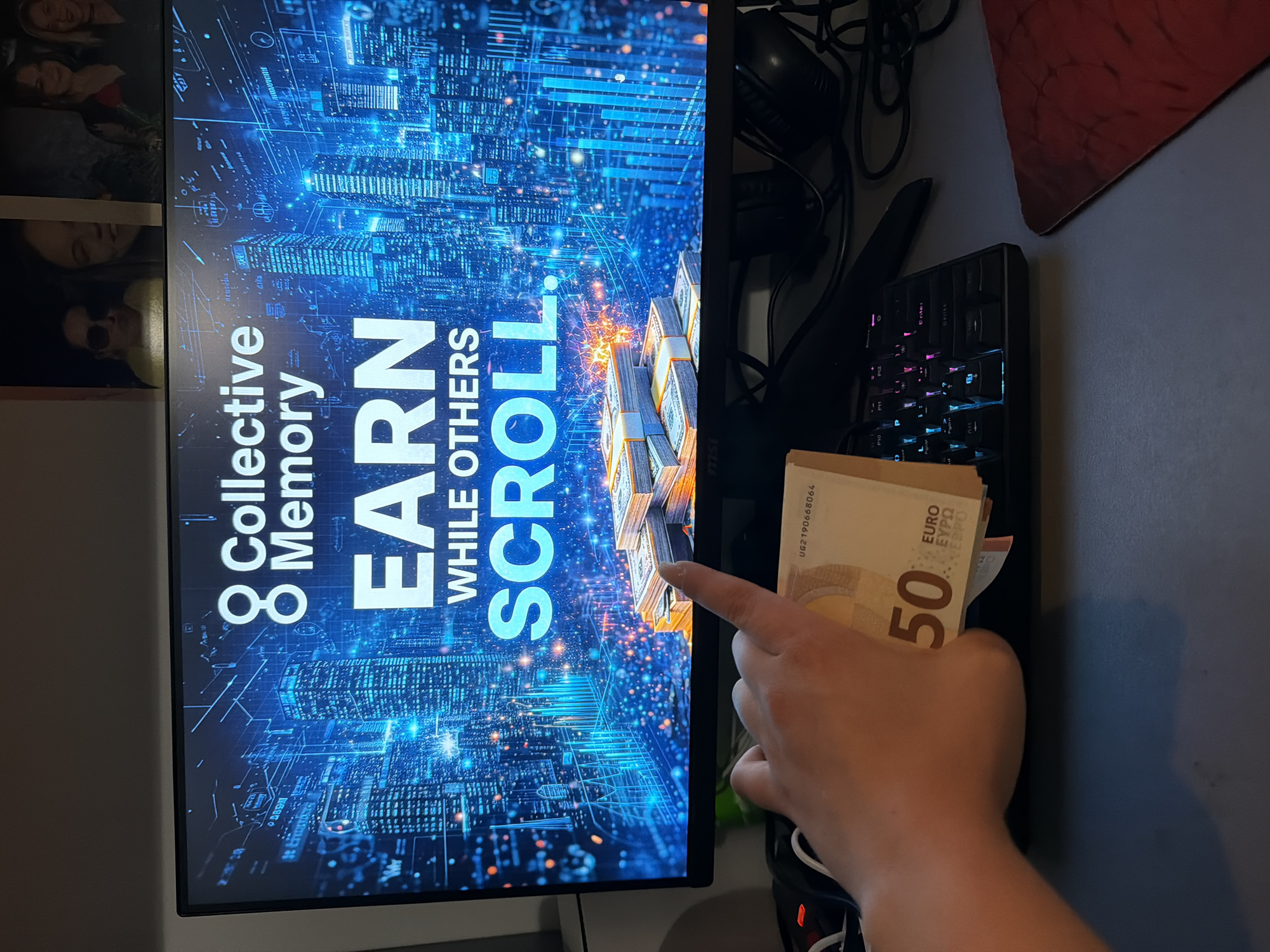 monitor displaying the text "8 Collective Memory EARN WHILE OTHERS SCROLL"