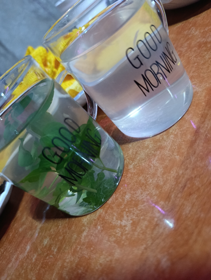 - "The image displays two identical clear glass mugs, each inscribed with the phrase "GOOD MORNING" in black capital letters, positioned on a reddish-brown, textured surface" by FM-QMs472, licensed under CC BY 4.0