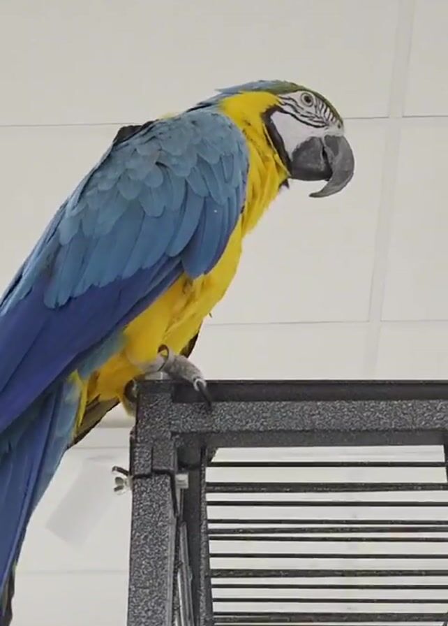 blue and yellow macaw perched on top of a gray metal birdcage. The bird looks to the side, opens its beak, and then looks back in the original direction. The background is a white ceiling with tiles.