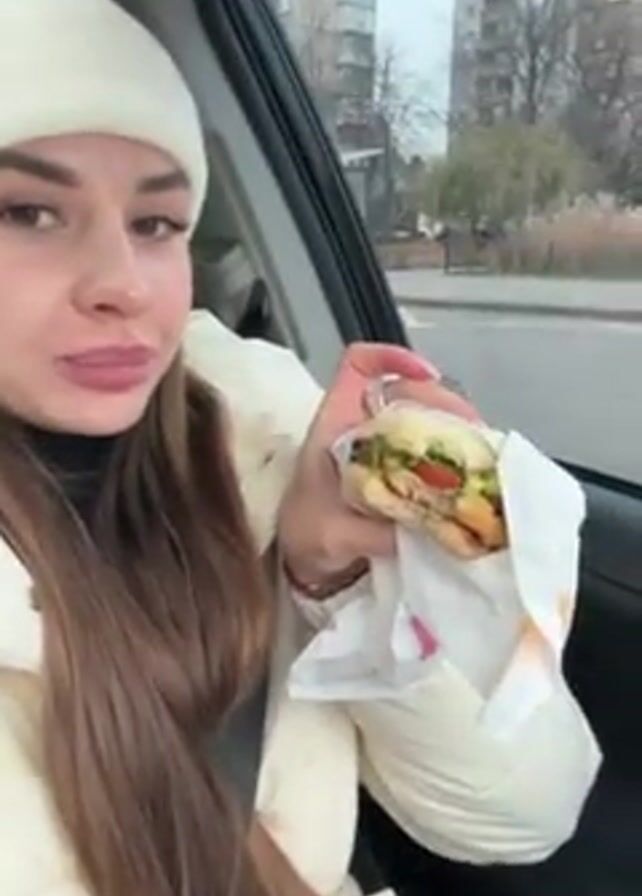 woman in a car, wearing a white beanie and jacket, eating a sandwich. The sandwich appears to contain chicken, lettuce, and tomato. She takes a bite of the sandwich with the wrapper still covering the majority of the contents. Outside the car, there's a street and a building visible.