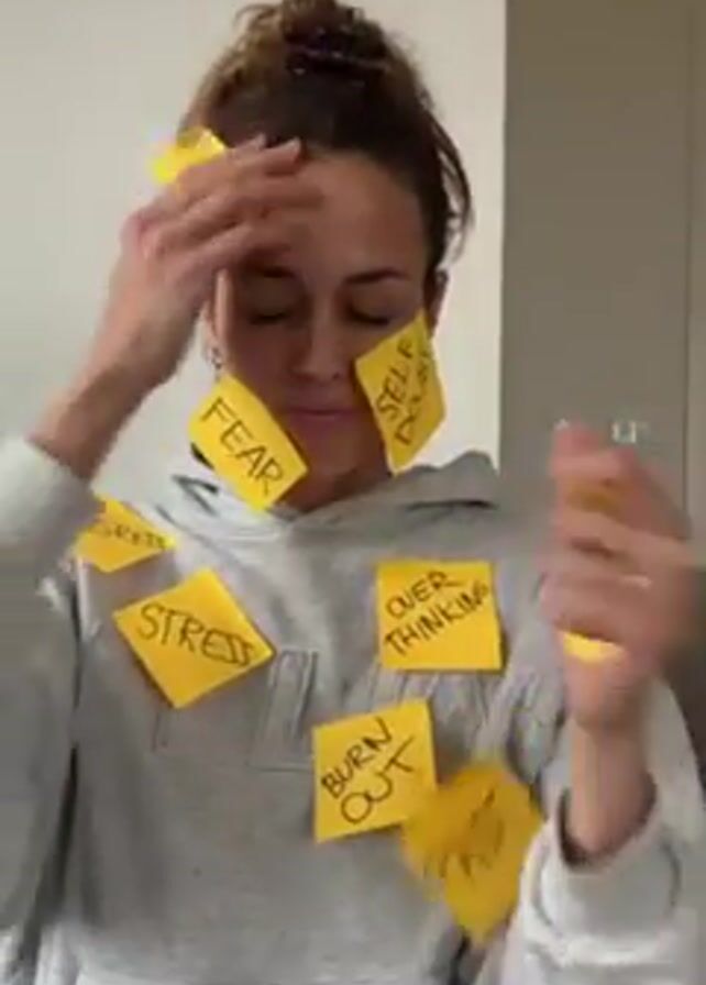 A woman is shown in a casual indoor setting. She has light-brown hair pulled back into a messy bun and wears a grey hoodie. Initially, multiple yellow sticky notes, each with a negative word like "Guilt," "Fear," "Self Doubt," "Regrets," "Stress," "Overthinking," and "Burn Out," are stuck to her face and chest. She removes the sticky notes, crumples them into a ball, and throws them upwards, smiling, as if releasing those feelings.