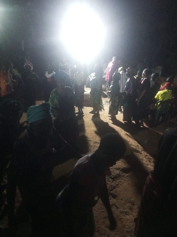 A crowd of people gathers outdoors at night, illuminated by a bright overhead light source. Individuals are dressed in varied attire, including patterned fabrics and head coverings. Shadows are cast on the ground. The scene appears to be a social gathering or event, possibly a community celebration, where people are standing and interacting. The lighting conditions create a dramatic effect with strong contrasts between light and dark.