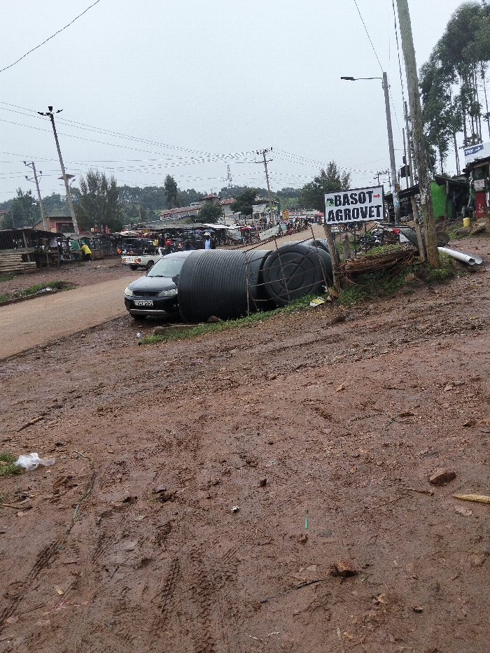 The image depicts a rural or semi-urban street scene within Nyansiongo ward, Kenya, under an overcast sky. The foreground consists of reddish-brown, muddy earth exhibiting numerous tire tracks and footprints, with a crumpled white plastic bag on the left. A black SUV, license plate KCB 943J, is parked on the left edge of a dirt road, partially obscured by a large, black, horizontally oriented ribbed water tank lying on a grassy embankment to its right. Another smaller, black cylindrical tank is visible near the larger one, partially supported by a metal frame. To the right of the tanks, a white and green directional sign reads "BASOT AGROVET" with an arrow pointing right. Numerous utility poles with overhead power lines are visible throughout the scene. In the background, a bustling market area lines the unpaved road, featuring various makeshift stalls and shops with corrugated iron roofs. Multiple individuals and vehicles, including motorcycles and a white pick-up truck, are present in the market area. Tall trees are visible on a distant hill to the right.