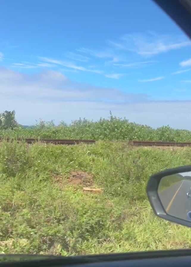 view from inside a car moving along a road. The car is on the right-hand side of the road, and the view from the passenger-side window shows a green grassy area with some bushes and small trees. Beyond the grass and bushes, there appears to be a body of water, potentially the ocean or a large lake, with a light blue sky and scattered clouds above. There's also a glimpse of the road and surroundings in the car's side mirror. The video is taken during daylight with good lighting.