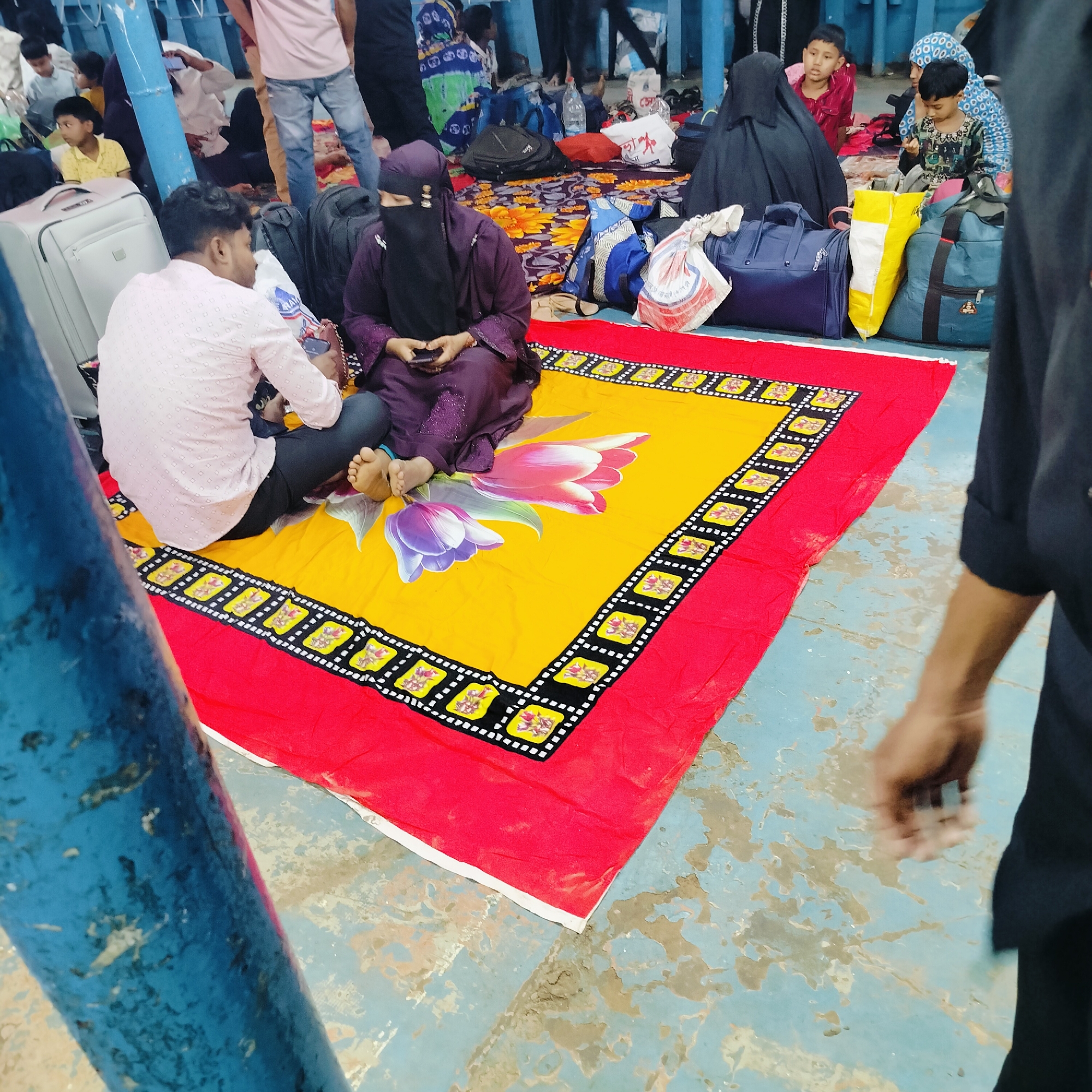 This image captures a scene on what appears to be a passenger ferry deck or waiting area in the city of Bhola, Bangladesh