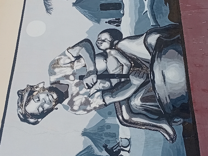 A grayscale mural depicts a traditional domestic scene on a wall in Lokoja, Nigeria
