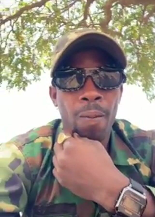 A man wearing a camouflage uniform, cap, and dark sunglasses is looking at the camera with a serious expression