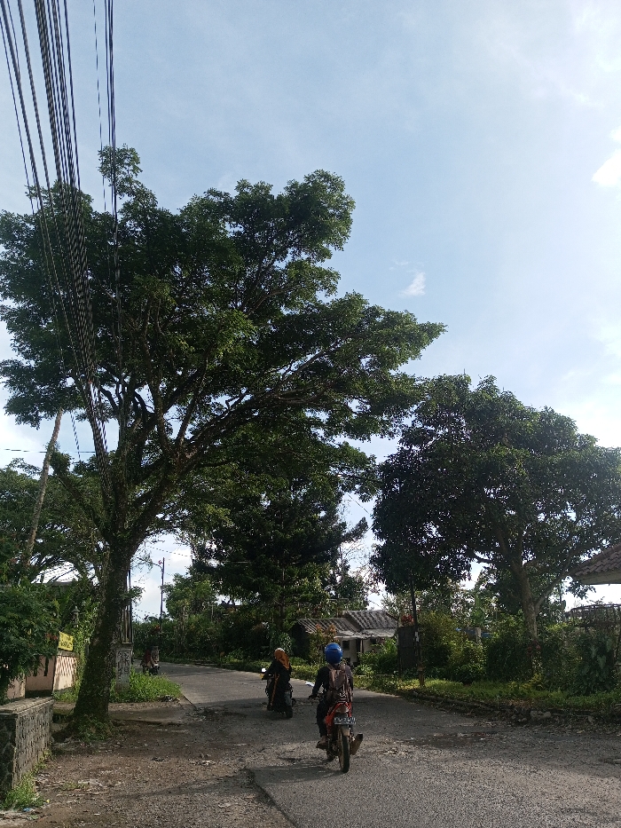A road winds through a rural area with lush trees lining the sides. Two motorbikes are traveling along the road, moving away from the viewer. The sky is blue with scattered clouds, visible above the tall trees. Power lines extend across the top left corner. A small building can be seen amongst the trees in the background. The road is asphalt with some imperfections.