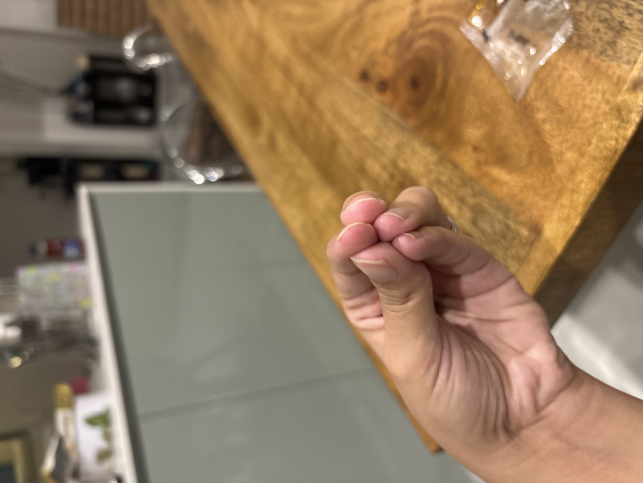 The scene depicts a close-up, indoor setting within a residence located in Durban, South Africa. In the immediate foreground, a human left hand with a medium skin tone is positioned, making a gesture where the thumb, index, middle, ring, and pinky fingers are drawn together at their tips, forming a pinched-finger configuration. A metallic ring is visible on the hand's left ring finger. The hand rests slightly above or is positioned near a wooden table that dominates the midground, featuring a distinctive grain pattern and a warm, light brown finish. The table surface shows an inlay or design near its edges. To the right on the table, a small, clear plastic bag containing indistinct items is partially visible and out of focus. The background is significantly blurred, indicating a shallow depth of field. On the left, a light sage-green kitchen cabinet or island structure with a white countertop is visible. Blurred objects, possibly kitchen utensils and a small potted plant, are discernible on the countertop. To the right of the cabinet, translucent or clear chairs are vaguely present, positioned behind the wooden table. Further back and to the right, a darker shelving unit with indistinct items is partially visible. The lighting appears to be interior and even, with no harsh shadows, suggesting ambient or artificial illumination.