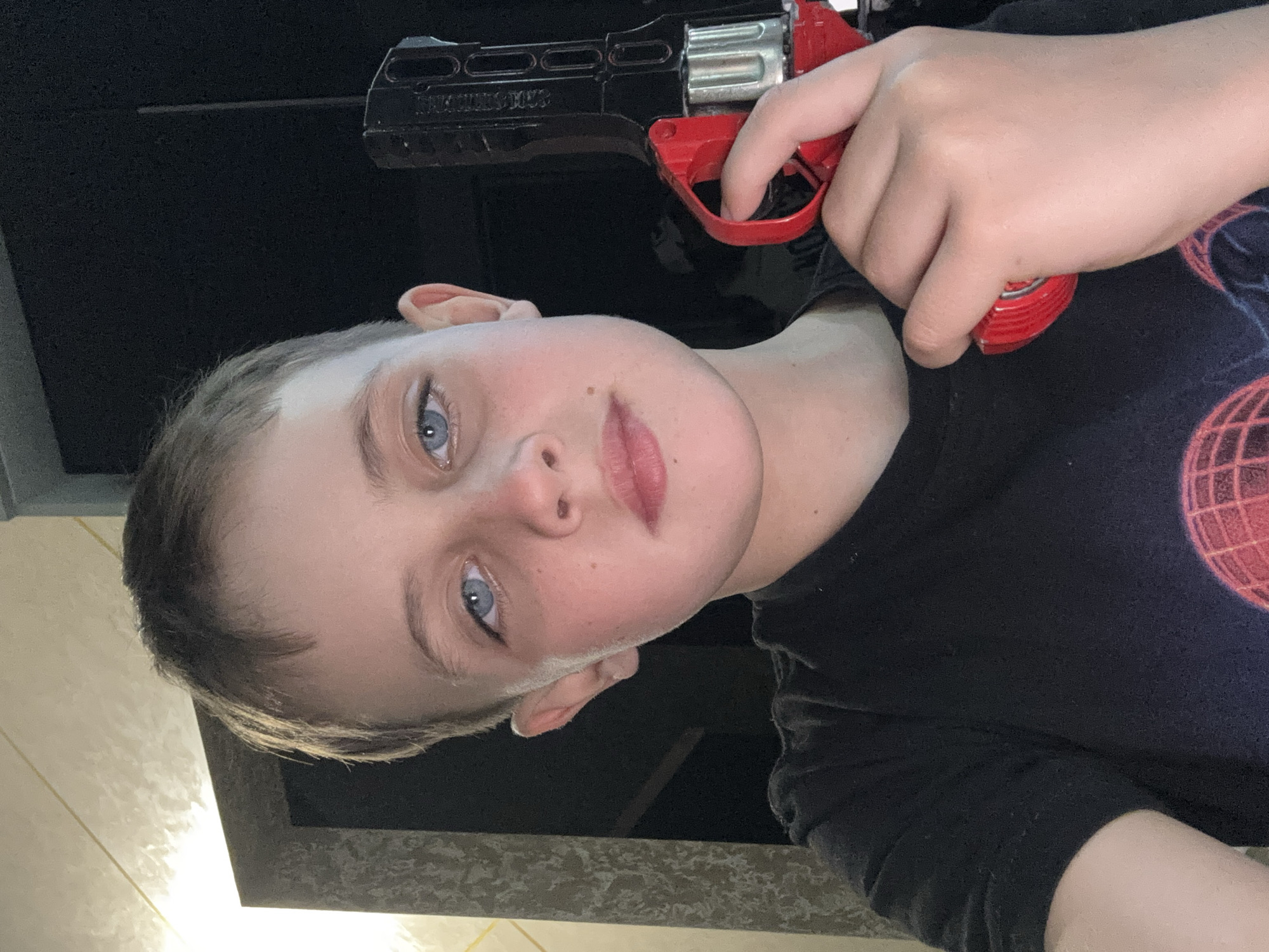 A boy with fair skin, blue eyes, and short blond hair faces the camera. He holds a toy revolver with a black body and red handle and trigger. His finger is on the trigger. He wears a black t-shirt with a red globe design on the sleeve. The background is dark and indistinct, but there's a hint of a textured surface near the bottom edge of the frame.