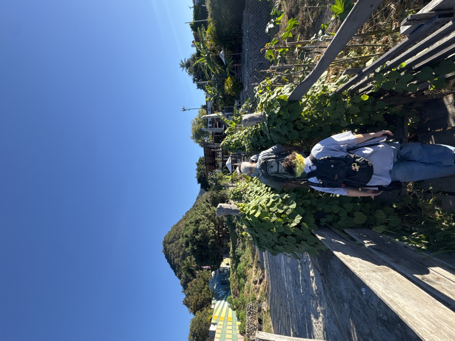 Two individuals are observed ascending a rustic wooden walkway within Panajachel, Guatemala, under a clear blue sky. The walkway, constructed from weathered wooden planks, is flanked on both sides by lush green climbing vines supported by wooden posts. The lead individual, an adult male, wears a grey short-sleeved shirt and a green and grey backpack. Following closely, an adult with bright yellow-green hair is dressed in a light blue and white striped short-sleeved collared shirt, blue jeans, and a black backpack. To the left of the walkway, an unpaved dirt path runs parallel to a low wall adorned with vibrant geometric murals in yellow, green, and blue. In the midground, various structures, including open-air seating areas with thatched roofs and white umbrellas, are visible amidst dense tropical vegetation, featuring what appear to be banana plants. A prominent, heavily forested conical mountain rises directly in the background, anchoring the natural landscape. The scene is illuminated by bright sunlight, casting distinct shadows.