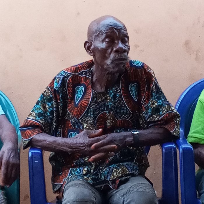An elderly, dark-skinned male is depicted seated in the City of Orlu, Nigeria