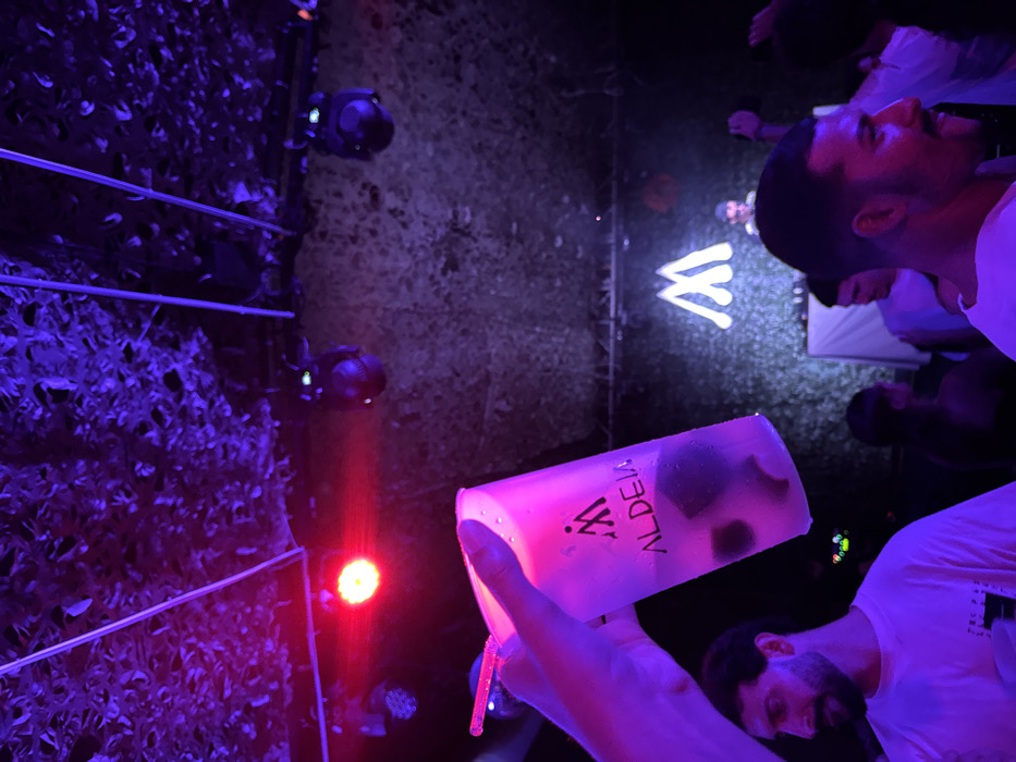 A night scene features people in white shirts enjoying an outdoor event. A lit-up "W" logo stands on the lawn, illuminated by purple and red lights. One person holds a drink with the word "ALDEIA" on it. Spots with lights are scattered, accentuating greenery and the social atmosphere. The image is oriented sideways, with people facing right, focusing on a blend of social interaction and event branding.