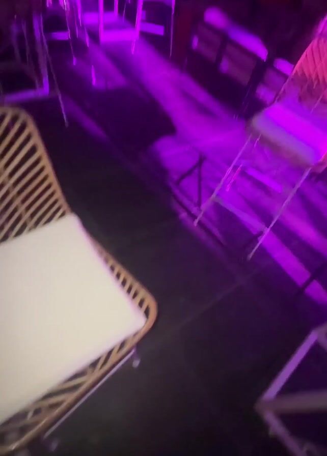 The video is shot indoors, seemingly at a bar or club. There are multiple people seated at tables with rattan chairs. The lighting is dark, with purple and red lights. Two women are at a table, one in a black dress with cutouts and the other in a black top. One woman holds a smartphone. Loud music is playing in the background. The video is shaky and appears to have been taken with a mobile phone.