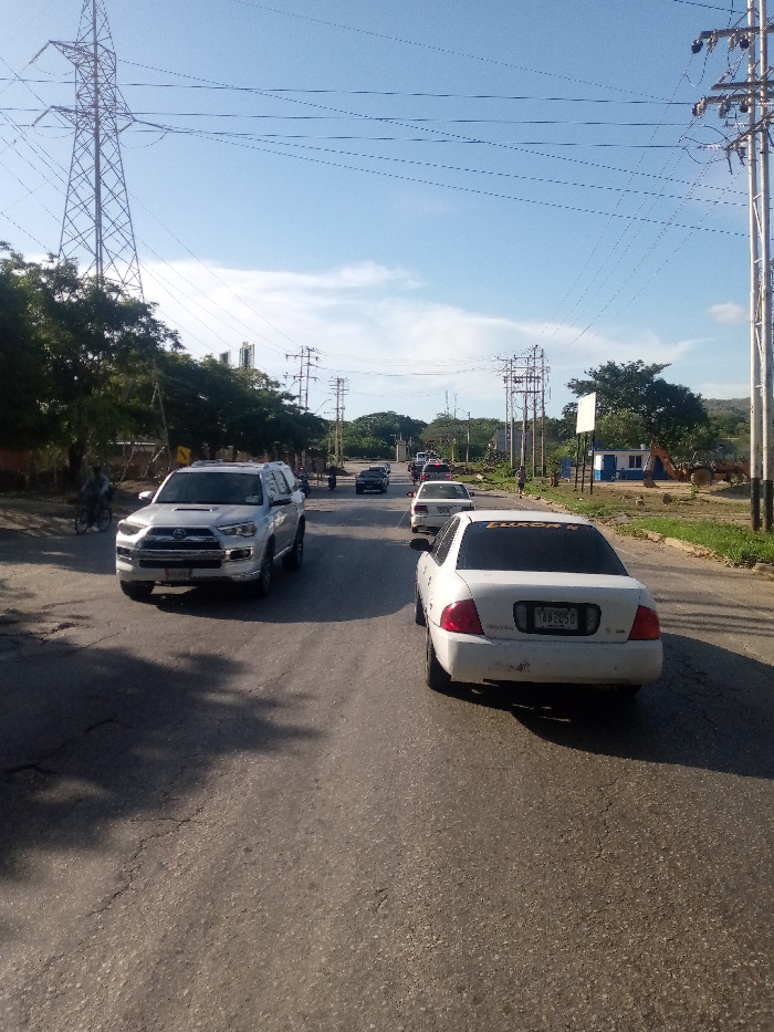 The image presents a daytime street scene in La Asunción, Venezuela, looking forward from within a moving vehicle