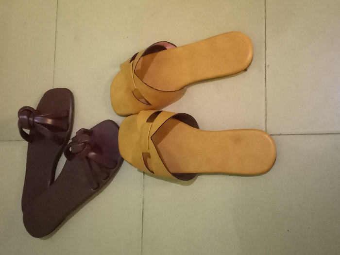 The location is undetermined. No people are visible. The scene depicts two pairs of flat slip-on sandals resting on a light-colored tiled floor with visible grout lines. The upper pair consists of two dark brown sandals, each featuring a prominent knotted strap design over the instep, positioned at an acute angle to each other. The lower pair consists of two mustard yellow sandals, each with a crisscrossing strap design over the instep, aligned parallel to each other.