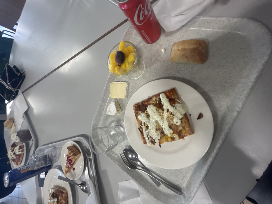 The image depicts two grey rectangular cafeteria trays laden with various food items and beverages, set on grey tables in what appears to be a self-service restaurant or cafeteria in Strasbourg, France. No specific identifying landmarks are visible to pinpoint the exact address within the city. In the foreground, the primary tray holds a white oval plate featuring a rectangular slice of flatbread or pizza topped with cheese, corn kernels, small pieces of what appears to be bacon or similar meat, and a generous drizzle of a light green/white creamy sauce. To the left of the plate are a silver fork and spoon. An empty clear glass tumbler sits above the plate. To the right of the glass, two wedges of cheese are present: one soft, white-rinded (resembling Brie or Camembert) and another firmer, yellower cheese. A small, stemmed glass bowl contains a mix of diced yellow fruit (likely mango) and a single dark purple fruit (possibly a plum or large grape). A small, crusty bread roll is positioned below the fruit bowl. A red Coca-Cola can and a crumpled white napkin are visible on the far right. In the midground, a second, partially visible grey tray displays a white plate with a slice of tart or pie, adorned with a reddish fruit topping and small specks. Alongside it are a fork, spoon, and an empty clear glass. A blue and white can with "ORIGINAL" text is upright next to the glass. Further back on this tray, another white plate holds a dish resembling a pizza or pasta bake, topped with a white sauce or melted cheese, and a small dark dessert in a glass with a dollop of white cream on top. The background shows a smooth grey tabletop extending away from the trays. A black handbag with a silver chain strap is visible on the table's right side. No individuals are clearly visible in the frame, though the setting implies patronage. The overall environment suggests an institutional or casual dining facility.
