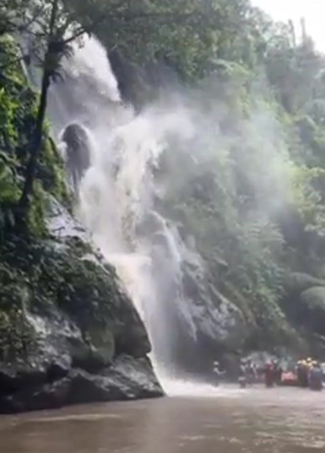 tall waterfall cascading down a rocky cliff covered in lush green vegetation, with a group of people in brightly colored life vests and rafts gathered at the base of the waterfall in a river. The water appears murky and brown. The waterfall creates a mist as it crashes into the river. The overall atmosphere is one of a natural, somewhat wild, environment.