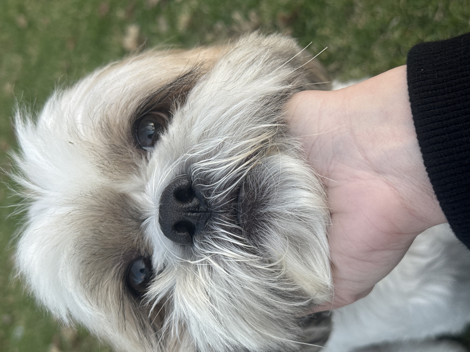 - "A close-up, slightly tilted image shows a tan and white Shih Tzu-type dog being held by a human hand" by FM-VS3GA3, licensed under CC BY 4.0