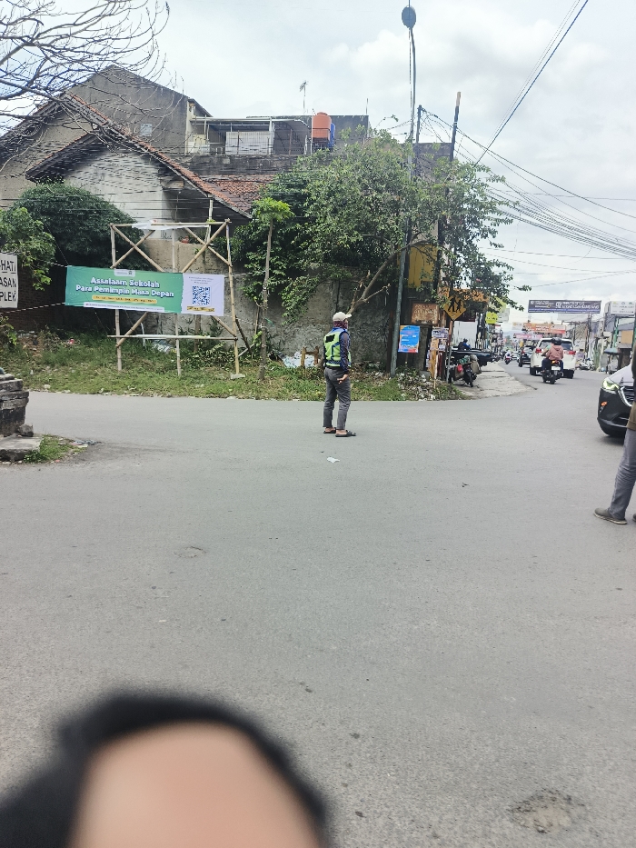 A street view shows a man in a safety vest standing at an intersection. There are several vehicles visible further down the street. A building with a tiled roof sits on the left side of the image, and a banner is propped up on a bamboo frame in front of it. Wires crisscross the sky, and a blurry object is visible in the foreground.