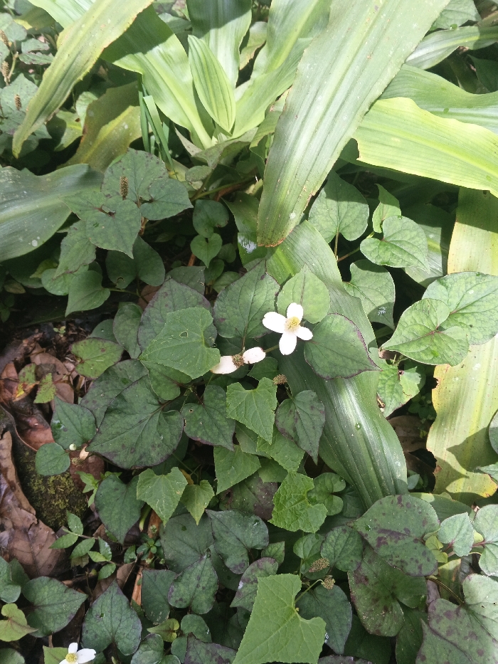 A close-up, top-down view captures a dense ground cover of vegetation in the city of Tây Ninh, Vietnam. The scene is dominated by numerous Houttuynia cordata plants, characterized by heart-shaped leaves, primarily green with irregular reddish-brown blotches and margins on many surfaces. Several white flowers, each composed of four distinct white petal-like bracts surrounding a small yellow central cluster of florets, are visible, with one prominent in the upper right quadrant. Smaller, younger heart-shaped green leaves are also present. In the background and interspersed among the Houttuynia cordata, larger, elongated, bright green leaves of a different herbaceous plant species are visible, notably in the upper and right portions of the frame. The underlying ground consists of dark brown soil and decaying organic matter. Natural sunlight illuminates the scene, suggesting an outdoor, daytime environment. No individuals, animals, or artificial objects are depicted.