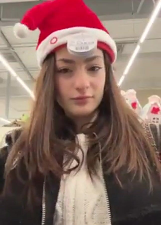A woman with long brown hair, wearing a white sweater and a black jacket, and a red and white Santa hat, stands in an aisle of a store with shelves filled with Christmas decorations, including gingerbread houses