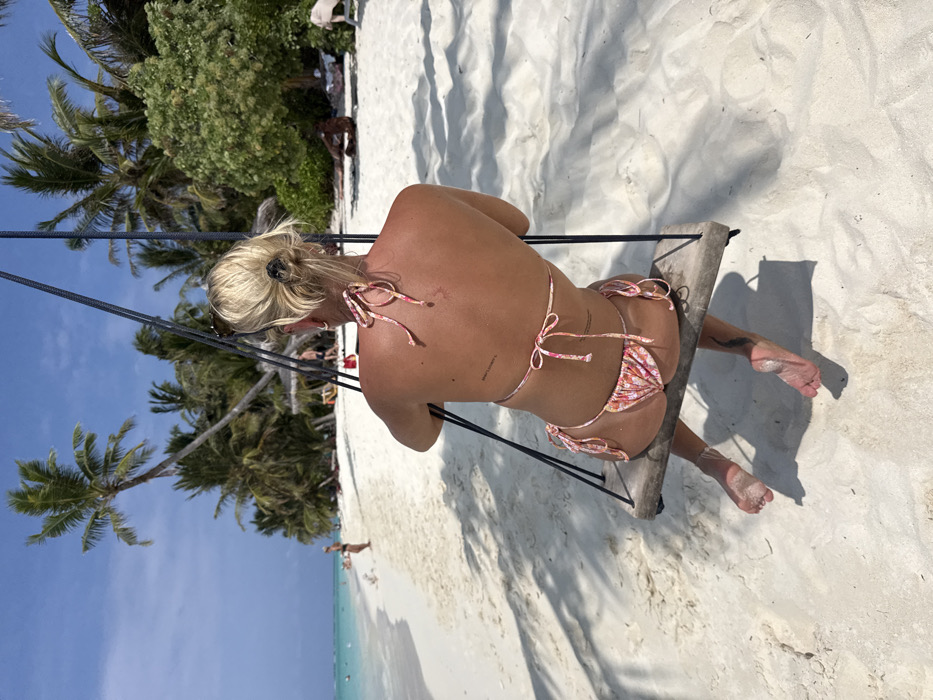 A blonde woman in a floral bikini sits on a wooden swing at a beach. She is facing away from the camera and has her hair pulled up in a clip. The beach has white sand and clear blue water. Palm trees are visible in the background. The swing hangs from a wooden frame.