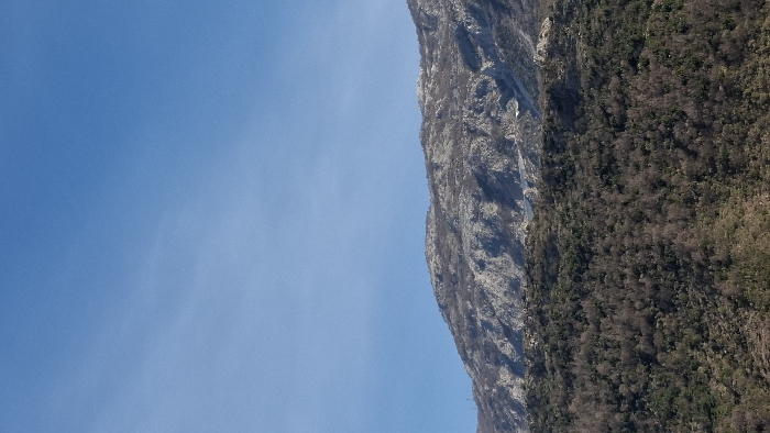 The image displays a vast mountainous landscape under a clear sky, consistent with the terrain inland from Budva, Montenegro. The upper two-thirds of the frame are occupied by a light blue sky featuring faint, horizontally-oriented cirrus clouds. Below the sky, a prominent, rugged mountain range displays extensive exposed light-grey limestone formations, interspersed with sparse, dark vegetation. A large, lighter-colored section on a distant peak suggests a quarry or significant geological erosion. The lower third of the image shows a foreground of densely vegetated hills, covered in a mix of dark green and brownish deciduous trees and shrubs, indicating a non-summer season. No human subjects, animals, or man-made structures are discernible within the frame.