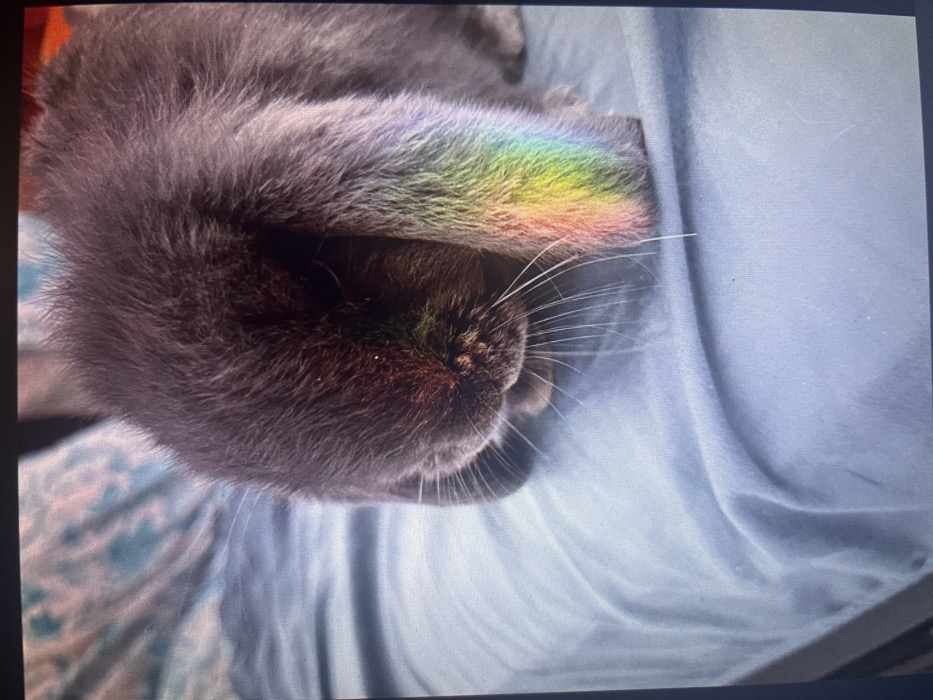 A gray cat rests on light blue fabric. Part of its face, including the nose and whiskers, is visible. A band of rainbow light falls across the cat's fur. The fur is dense and slightly ruffled. The background fabric is smooth with gentle folds. Another fabric, possibly a blanket, with a faint pattern is beneath the cat.